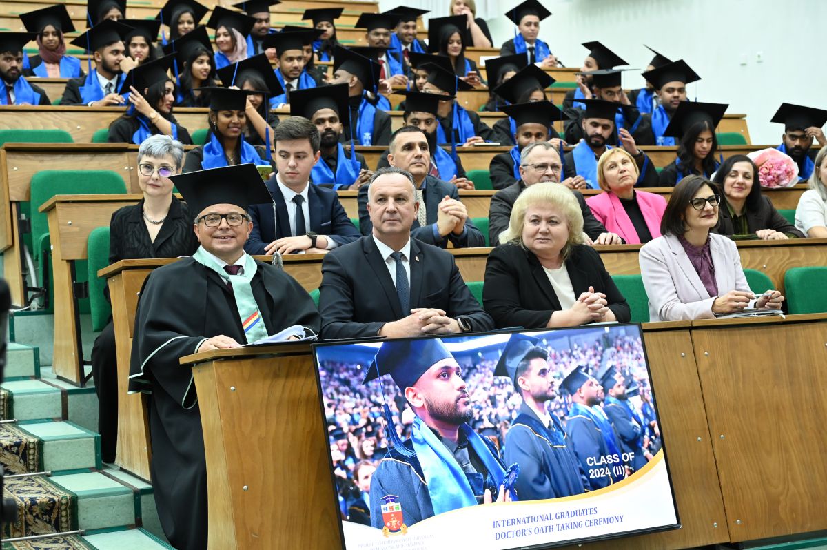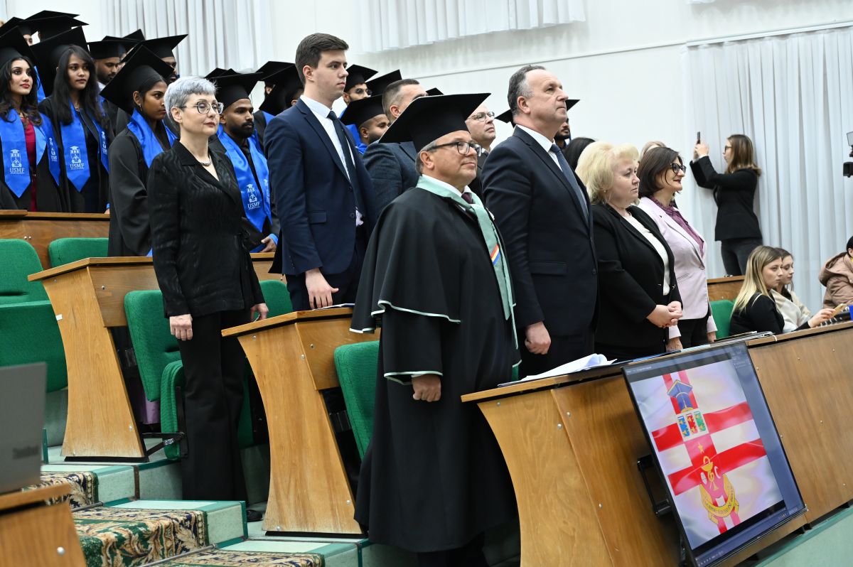 The solemn event was inaugurated by rector Emil Ceban, who congratulated the young graduates and thanked them for choosing to study in the Republic of Moldova and at our university. "We are sure that you will practice medicine with dignity, honesty, empathy and responsibility, and you will be the best ambassadors of the University in the world," the rector stated.