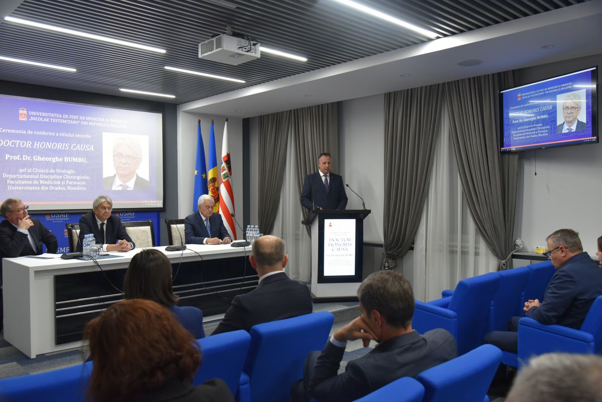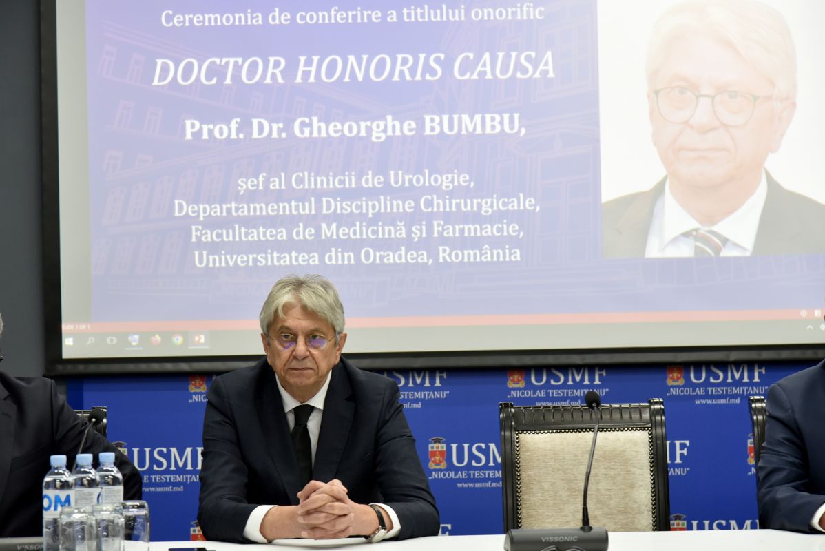 The academic track record of Nicolae Testemitanu University’s brilliant personalities was completed with another remarkable name – university professor Gheorghe Bumbu, doctor of medicine, head of the Urology Clinic within the Department of Surgical Disciplines, Faculty of Medicine and Pharmacy, University of Oradea, Romania, who was awarded the title of Doctor Honoris Causa by the University Senate during the ceremony that took place on October 13, 2022.