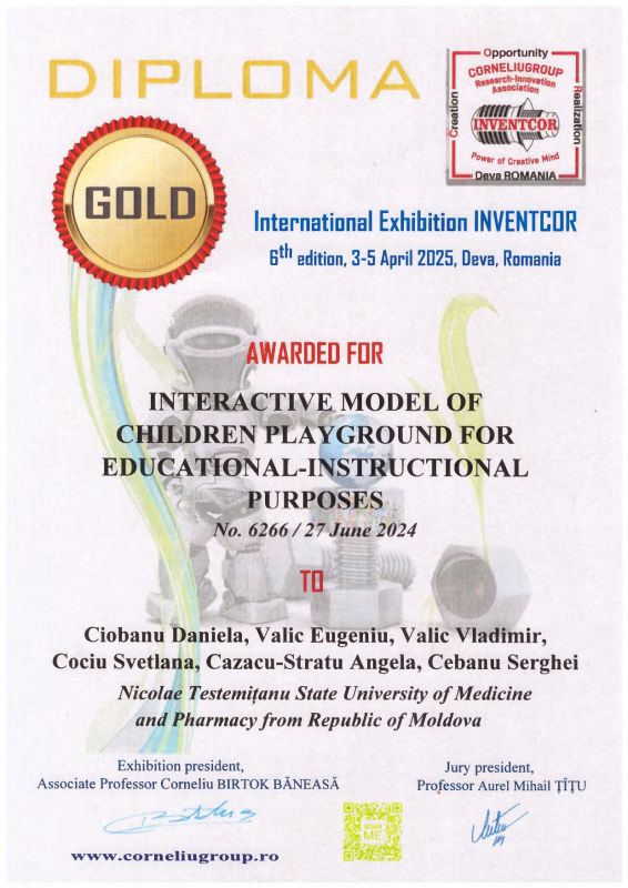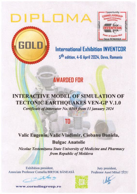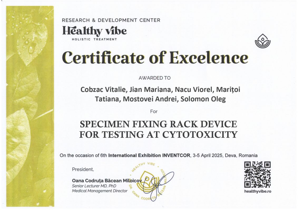 Inventatorii de la Universitatea de Stat de Medicină şi Farmacie „Nicolae Testemiţanu” au obținut 4 medalii de aur și 3 premii speciale la cea de-a VI-a ediție a Expoziției Internaționale „Inventcor”- 2025, ce s-a desfășurat în perioada 3-5 aprilie 2025 în orașul Deva, România. Cu medalii de aur au fost apreciate lucrările realizate de către echipa de inventatori: Vitalie Cobzac, Mariana Jian, Viorel Nacu, Tatiana Marițoi, Andrei Mostovei și Oleg Solomon.